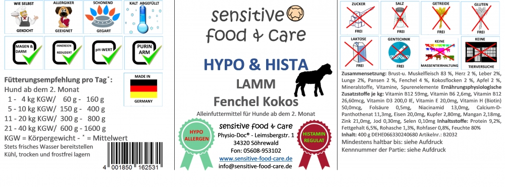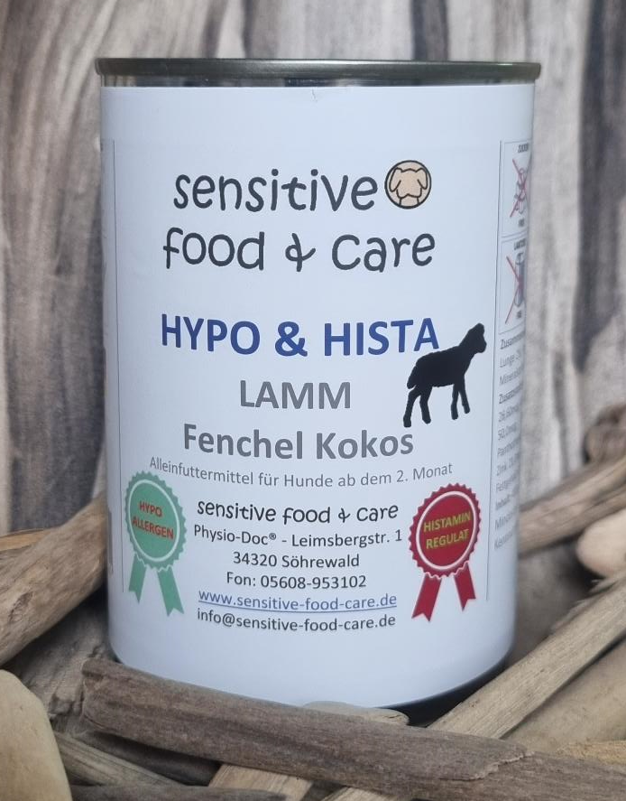 Diese Spezialkost HYPO-HISTA LAMM mit Fenchel, Kokos und weiteren Zutaten die für den hypoallergenen, sensitiven Hund besonders geeignet sind und zusätzlich zur Senkung der Histamin Last beitragen können.