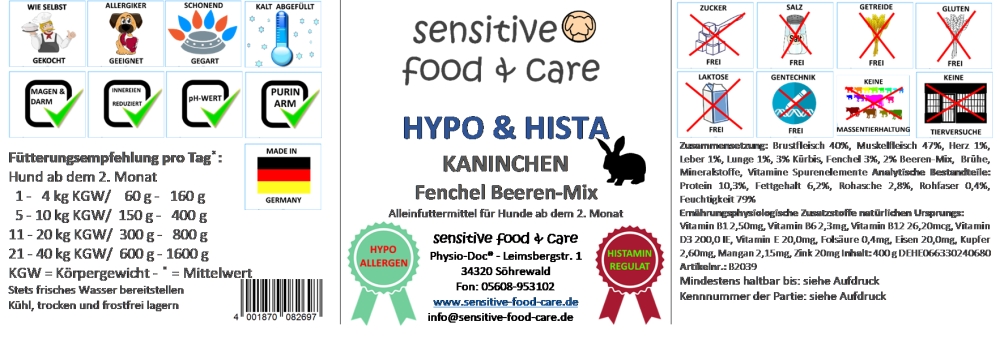 HYPO-HISTA KANINCHEN mit einem hohen Brust- und Muskelfleischanteil sowie u.d. Fenchel und einem Beeren-Mix, ist eine Rezeptur für die ganz besonderen Ansprüche Deines Hundes