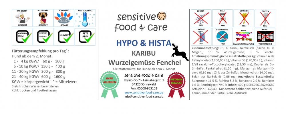 Zusammensetzung: 81 % Karibu-Kalbfleisch (davon 10 % Magen), 15 % Wurzelgemüse, 3 % Fenchel