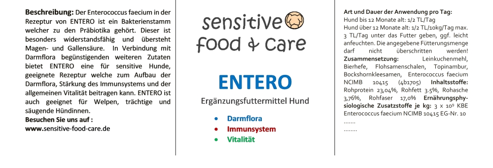 Der Enterococcus faecium in der Rezeptur von ENTERO ist ein Bakterienstamm welcher zu den Präbiotika gehört. Dieser ist besonders widerstandsfähig und übersteht Magen- und Gallensäure. ENTERO eine für sensitive Hunde, geeignete Rezeptur kann dazu beitragen das Wachstum nützlicher Darmbakterien zu verbessern. ENTERO enthält natürliche, die Verdauung harmonisierende Komponenten. ENTERO ist auch geeignet für Welpen, trächtige und säugende Hündinnen.