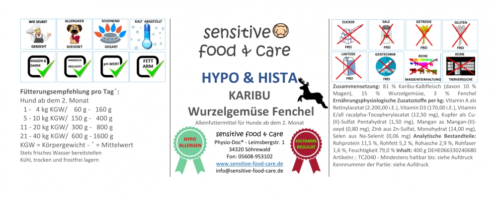 Zusammensetzung: 81 % Karibu-Kalbfleisch (davon 10 % Magen), 15 % Wurzelgemüse, 3 % Fenchel